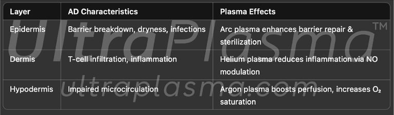 Atopic Dermatitis is a chronic, inflammatory skin disorder marked by epidermal barrier dysfunction, immune dysregulation, and altered dermal microbiome. UltraPlasma™ multi-platform plasma therapy system, offers a novel, non-invasive approach by utilizing arc, argon, and helium plasmas to restore barrier integrity, reduce microbial burden, and modulate inflammatory responses. This article discusses the biochemical, immunological, and physiological effects of UltraPlasma™ treatment on the skin layers and associated gas dynamics including ozone (O₃), nitric oxide (NO), and oxygen (O₂) micro-environments.