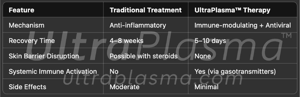 Traditional treatments involve corticosteroids and antihistamines, but these do not address the viral hypothesis nor support vascular normalization or immune modulation. UltraPlasma™ offers an advanced dermo-systemic intervention using multi-phase plasma fields.